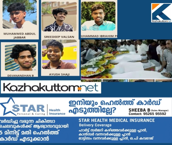 ആലപ്പുഴ കളര്കോട് ചങ്ങനാശേരിമുക്ക് ജംഗ്ഷനില് കാറും കെഎസ്ആര്ടിസി ബസും കൂട്ടിയിടിച്ച് അഞ്ച് മെഡിക്കല് വിദ്യാര്ത്ഥികള് മരിച്ചു.