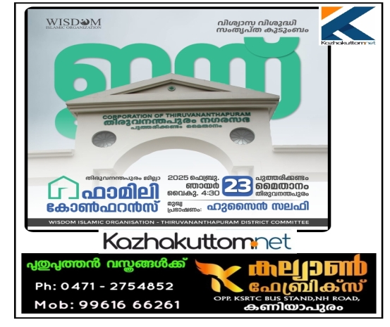 'വിശ്വാസ വിശുദ്ധി, സംതൃപ്ത കുടുംബം' എന്ന പ്രമേയത്തിൽ സംഘടിപ്പിക്കുന്ന ജില്ലാ ഫാമിലി കോൺഫറൻസ് ഇന്ന് വൈകിട്ട് 4:30 മുതൽ തിരുവനന്തപുരം പുത്തരിക്കണ്ടം മൈതാനിയിൽ നടക്കും.