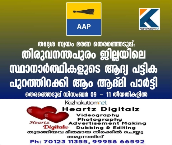 തദ്ദേശ സ്വയം ഭരണ തെരഞ്ഞെടുപ്പ്: തിരുവനന്തപുരം ജില്ലയിലെ സ്ഥാനാർത്ഥികളുടെ ആദ്യ പട്ടിക പുറത്തിറക്കി ആം ആദ്മി പാർട്ടി