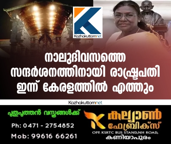നാലുദിവസത്തെ സന്ദർശനത്തിനായി രാഷ്ട്രപതി ദ്രൗപതി മുർമു ഇന്ന് വൈകിട്ട് 6. 20ന് തിരുവനന്തപുരം വിമാനത്താവളത്തിൽ എത്തും
