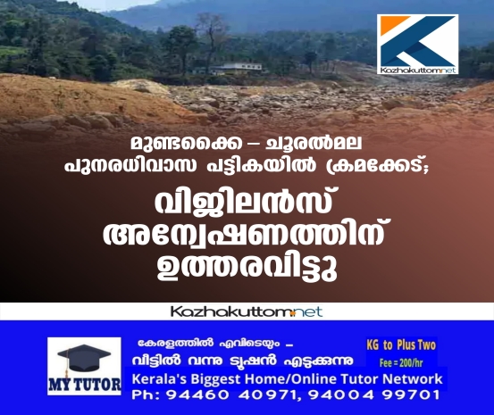ദുരന്തബാധിതരുടെ പുനരധിവാസത്തിന് സർക്കാർ തയ്യാറാക്കിയ പട്ടികയിൽ ഉദ്യോഗസ്ഥരുടെ സഹായത്തോടെ വ്യാപക ക്രമക്കേടു ഉണ്ടായിട്ടുണ്ടന്നപരാതി പരിശോധനക്ക് വിജിലൻസ് ഡയരക്ടർ ഉത്തരവിട്ടു