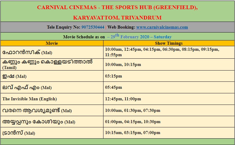 Movie Schedule From Carnival Cinemas Greenfield Stadium Trivandrum - 29th Feb 2020