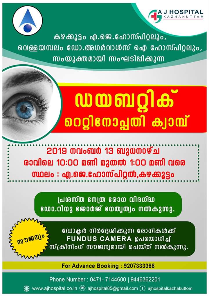 കഴക്കൂട്ടം എ.ജെ ഹോസ്പിറ്റലിൽ ഡയബറ്റിക് റെറ്റിനോപ്പതി ക്യാമ്പ് നടക്കും