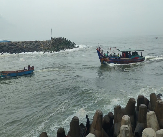മുതലപ്പൊഴിയിൽ മത്സ്യബന്ധന വള്ളം പുലിമുട്ടിലേക്ക് ഇടിച്ചു കയറി അപകടം.