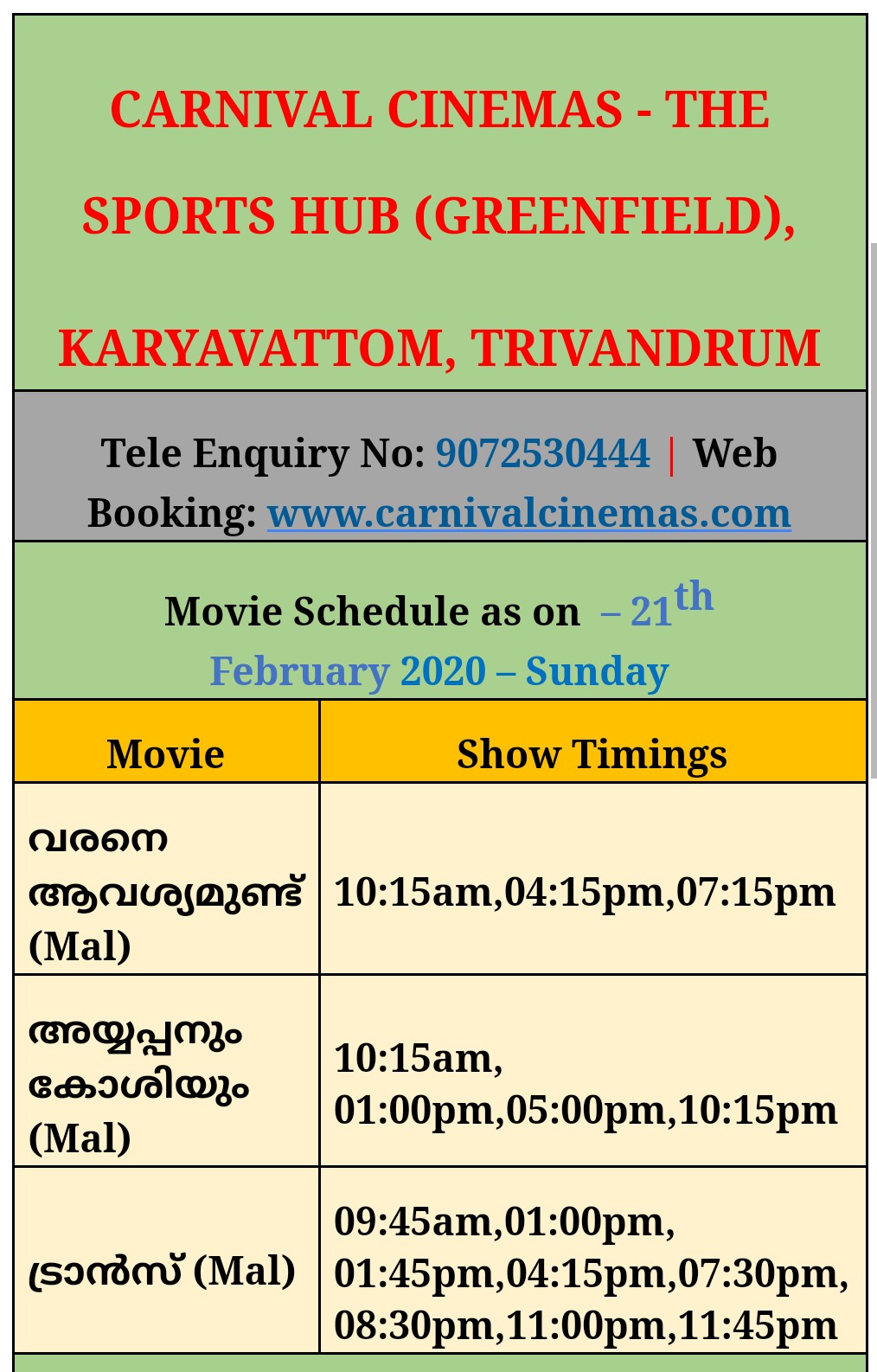 Movie Schedule From Carnival Cinemas Greenfield Stadium Trivandrum - 22nd Feb 2020