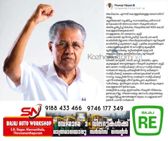 'ബജറ്റിൽ പോലും ഇത്രവലിയ നികുതി നിർദേശം ഉണ്ടാകാറില്ല. നിയമസഭയെയും ജനാധിപത്യത്തെയും വെല്ലുവിളിച്ചു ജനങ്ങളോട് യുദ്ധം ചെയ്യുകയാണ് ഉമ്മൻ ചാണ്ടി സർക്കാർ' എന്നും പോസ്റ്റിൽ പറയുന്നു.