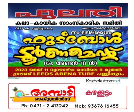 ടൂർണമെൻറ് മെയ് 11 രാവിലെ 9 മണി മുതൽ പള്ളിപ്പുറം ലീഡ്സ് അരീന ടർഫിൽ