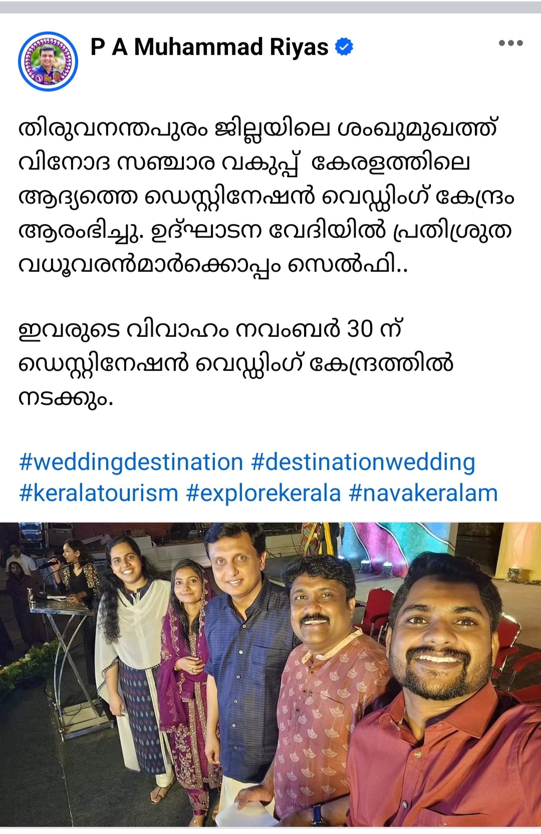 വിനോദ സഞ്ചാര വകുപ്പിന്റെ പൂര്ണ നിയന്ത്രണത്തിലുള്ള ഡെസ്റ്റിനേഷന് വെഡ്ഡിംഗ് കേന്ദ്രം ശംഖുംമുഖം ബീച്ചിന് സമീപമുള്ള പാര്ക്കിലാണ് ഒരുങ്ങിയിരിക്കുന്നത്. ബീച്ച് പാര്ക്കിലുള്ള വെഡ്ഡിംഗ് ഡെസ്റ്റിനേഷന് കേന്ദ്രം മന്ത്രി പിഎ മുഹമ്മദ് റിയാസ് ഉദ്ഘാടനം ചെയ്തു. ഡെസ്റ്റിനേഷന് വെഡ്ഡിംഗ് മുൻകൂർ ആയി ബുക്ക് ചെയ്ത് ലോകത്തെവിടെ നിന്നുള്ളവര്ക്കും ഇവിടെയെത്തി വിവാഹം നടത്താം.