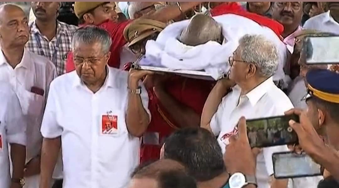 രാത്രി വെെകി വസതിയിലെത്തിച്ച മൃതദേഹത്തിൽ മുഖ്യമന്ത്രി പിണറായി വിജയനും എസ്.രാമചന്ദ്രൻപിള്ളയും എം.എ.ബേബിയും ഉൾപ്പെടെയുള്ള നേതാക്കൾ ചേർന്ന് രക്ത പതാക പുതപ്പിച്ചു. സഹോദരതുല്യനായ പ്രിയസഖാവിന് പുഷ്പചക്രം സമർപ്പിച്ച മുഖ്യമന്ത്രി, മുഷ്ടിചുരുട്ടി അഭിവാദ്യമർപ്പിച്ചു.