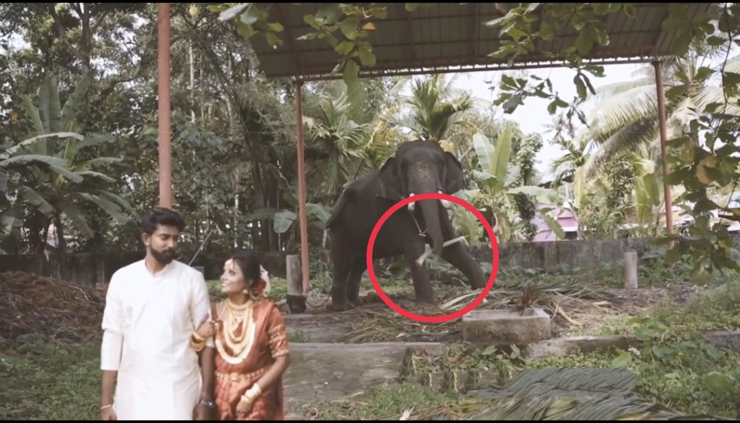വിവാഹച്ചടങ്ങിന് ശേഷം ഫോട്ടോ ഷൂട്ടിനായി എത്തിയ വധുവിന്റെയും വരന്റെയും നേരെ ശരവണൻ എന്ന ആന ഓലമടൽ എടുത്ത് എറിയുകയായിരുന്നു.
