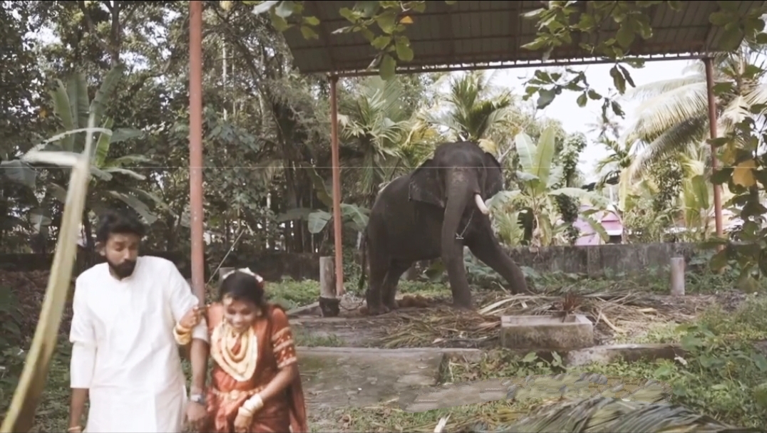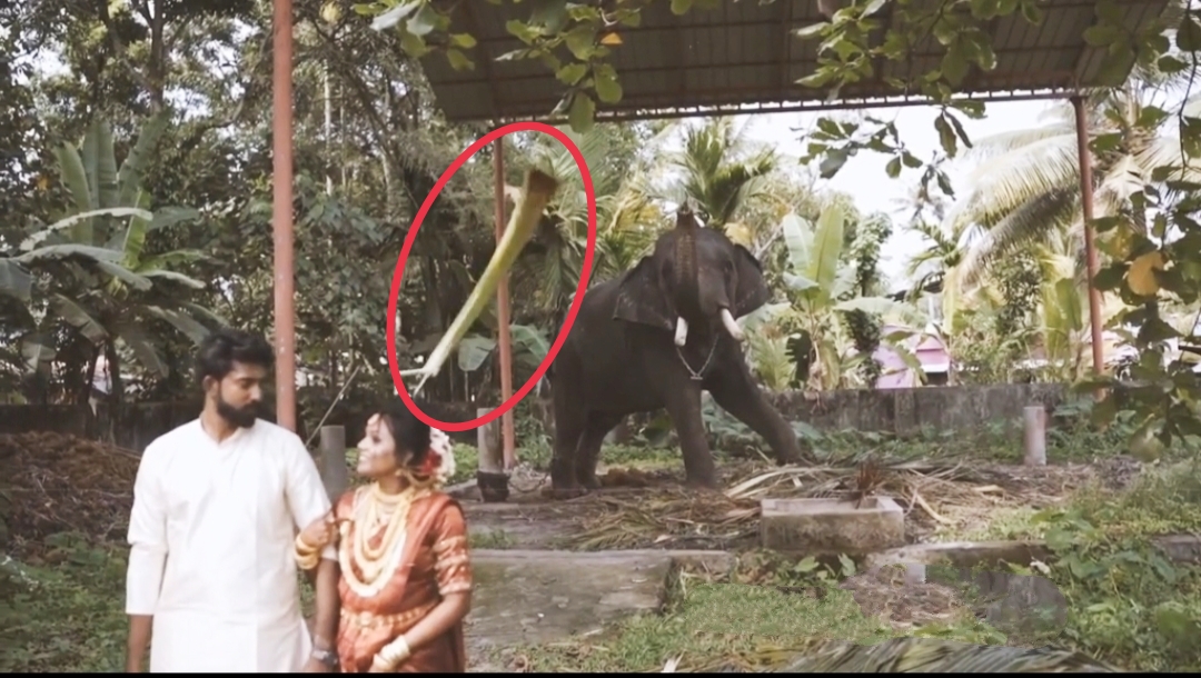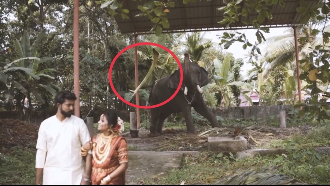 ഫോട്ടോ ഷൂട്ടിനിടെ വധൂവരന്മാർക്കുനേരെ ഓലമടൽ എറിഞ്ഞ് ആന