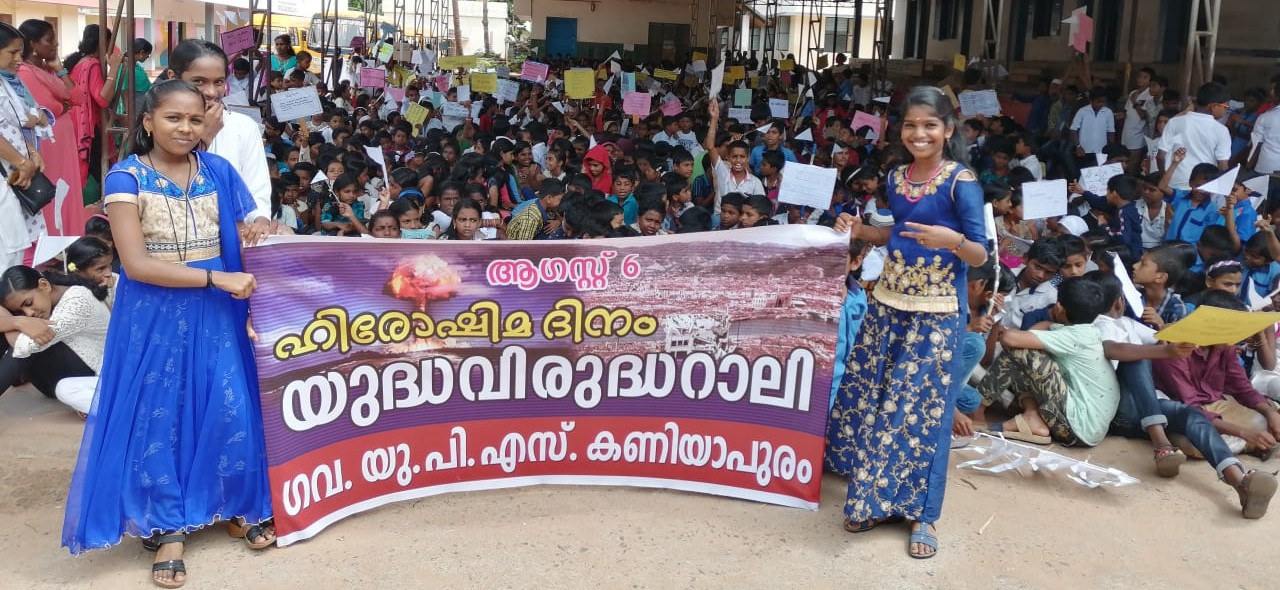 ഹിരോഷിമ ദിനാചരണം. സമാധാന സന്ദേശമുയർത്തി കണിയാപുരം ഗവ.യു.പി സ്കൂളിലെ കുട്ടികൾ നാടുണർത്തി