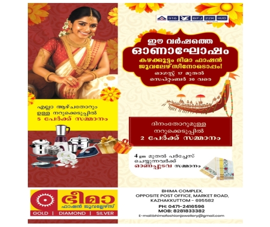 ഓണം പ്രമാണിച്ച് ഓഗസ്റ്റ് 17മുതൽ സെപ്റ്റംബർ 30 വരെ പർച്ചീസ് ചെയ്യുന്ന എല്ലാപേർക്കും അത്യാകര്ഷകമായ സമ്മാനങ്ങൾ ...... എല്ലാ ദിവസവും നറുക്കെടുപ്പിലുടെ 2 പേർക്ക് സമ്മാനം