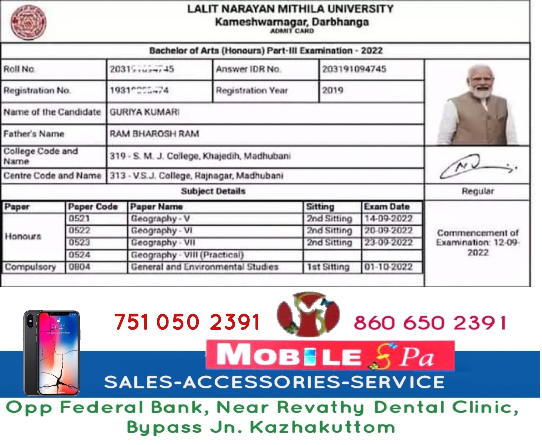 വിദ്യാർഥിയുടെ ഫോട്ടോക്ക് പകരം പ്രധാനമന്ത്രിയുടെ ഫോട്ടോ. ബിഹാറിലെ ദർഭംഗ ജില്ലയിലെ ലളിത് നാരായൺ മിഥില യൂണിവേഴ്സിറ്റി നൽകിയ ബി.എ പരീക്ഷയുടെ ഹാൾടിക്കറ്റിലാണ് പിഴവുപറ്റിയിരിക്കുന്നത്. പ്രധാനമന്ത്രി നരേന്ദ്ര മോദിയുടെ ഫോട്ടോ അടിച്ച ഹാൾടിക്കറ്റാണ് യൂണിവേഴ്സിറ്റി ഒരു വിദ്യാർഥിക്ക് നൽകിയത്.