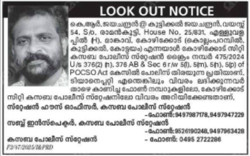 നാലു വയസ്സുകാരിയെ ജയചന്ദ്രൻ പീഡിപ്പിച്ചെന്ന പരാതിയിൽ പോക്സോ കേസെടുത്തത് കോഴിക്കോട് കസബ പൊലീസാണ്. കുട്ടിയുടെ ബന്ധു ചൈൽഡ് പ്രൊട്ടക്ഷൻ യൂണിറ്റ് മുഖേന നൽകിയ പരാതി പൊലീസിന് കൈമാറുകയായിരുന്നു.