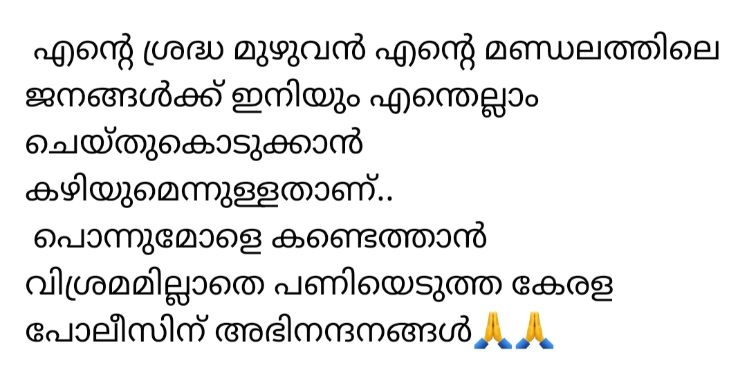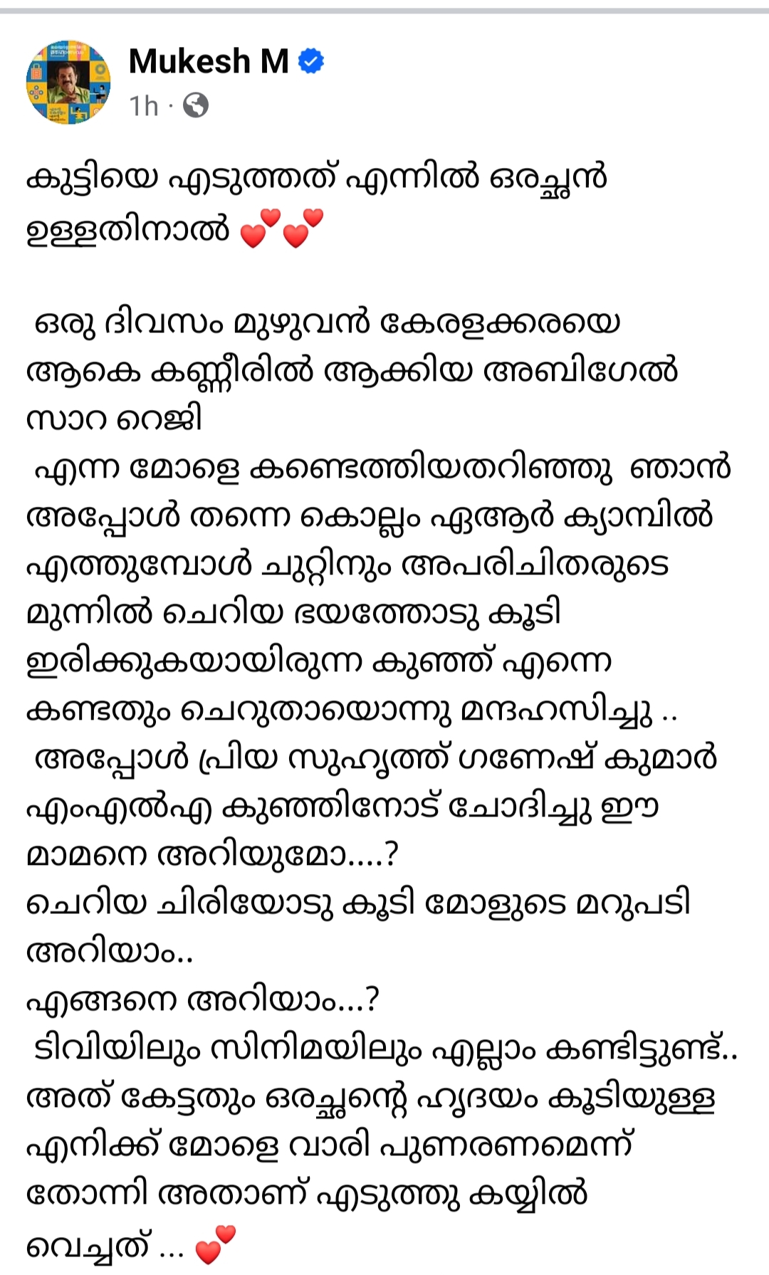 തിരുവനന്തപുരം: കുട്ടിയെ എടുത്തത് എന്നിൽ ഒരച്ഛൻ ഉള്ളതിനാലാണെന്ന് എം. മുകേഷ് എം.എൽ.എ. അബിഗേൽ സാറയോടൊപ്പമുള്ള ഫോട്ടോ ഉപയോഗിച്ച് ചില ട്രോളുകൾ സാമൂഹിക മാധ്യമങ്ങളിൽ പ്രചരിച്ചിരുന്നു. കാണാതായ കുട്ടിയോടൊപ്പം കൊല്ലം എം.എൽ.എ യെയും കണ്ടെത്തി എന്നായിരുന്നു ട്രോൾ. ഈ സാഹചര്യത്തിലാണ് മുകേഷ് ഫേസ്ബുക്കിൽ മറുപടി കുറിപ്പ് എഴുതിയത്. ചീറ്റിപ്പോയ നാടകക്കാരോട് പറയാനുള്ളത് എന്നെക്കൊണ്ട് ഒന്നും പറയിക്കരുതെന്നുമാണ് മുകേഷ് എഴുതുന്നത്.