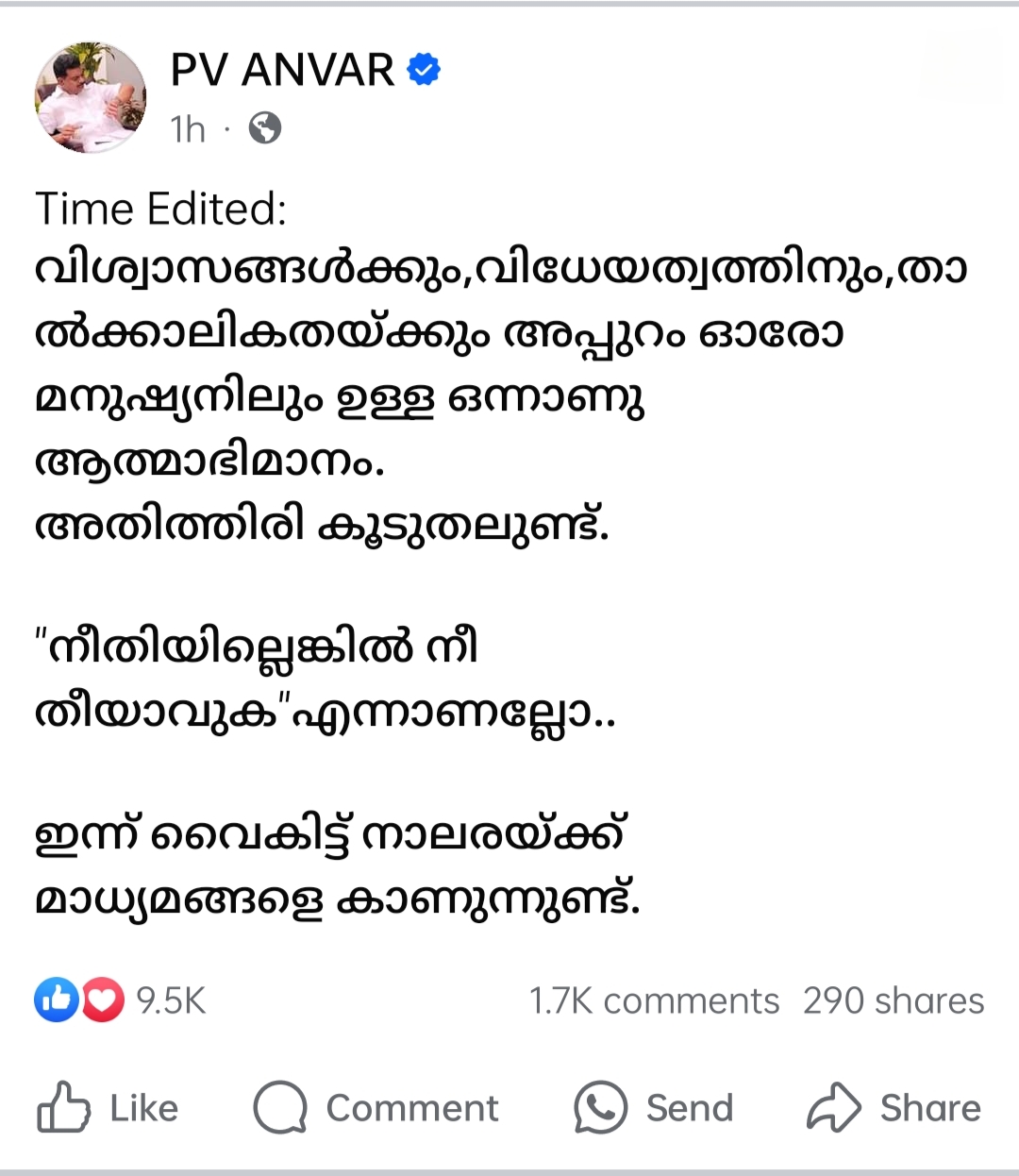 വിശ്വാസത്തിനും വിധേയത്വത്തിനും അപ്പുറമാണ് ആത്മാഭിമാനമെന്നും, അതിത്തിരി കൂടുതലാണെന്നും അൻവർ കുറിച്ചിട്ടുണ്ട്.